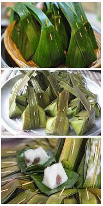 3. ห่อใบตองเป็นทรงสูง ใช้ใบมะพร้าวที่เตรียมไว้คาดและกลัดด้วยไม้กลัดให้เรียบร้อย ตัดปลายเตี่ยวให้เฉียงและยาวพองาม วางเรียงห่อขนมลงในชุดนึ่ง