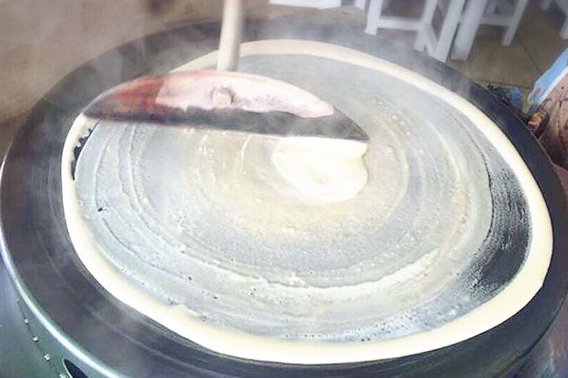 1.เปิดเตาแก็สให้ความร้อนปานกลาง ตักแป้งที่เตรียมไว้แล้ว เทลงบนเตา