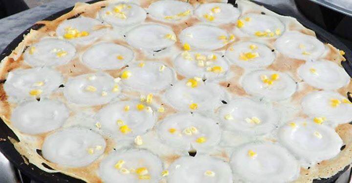 1.เปิดเตา รอจนกะะร้อน ทาน้ำมัน แค่พอ ติดกะทะ หยอดตัวแป้งลงไปครึ่งเดียว เขย่า ให้แป้งติดเบ้า
