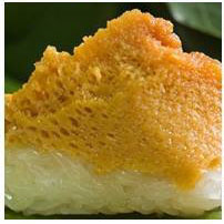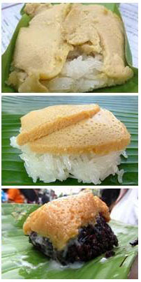 4.สังขยาเสิร์ฟกับข้าวเหนียวมูน ทั้ง ขาว ดำ และเหลือง