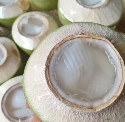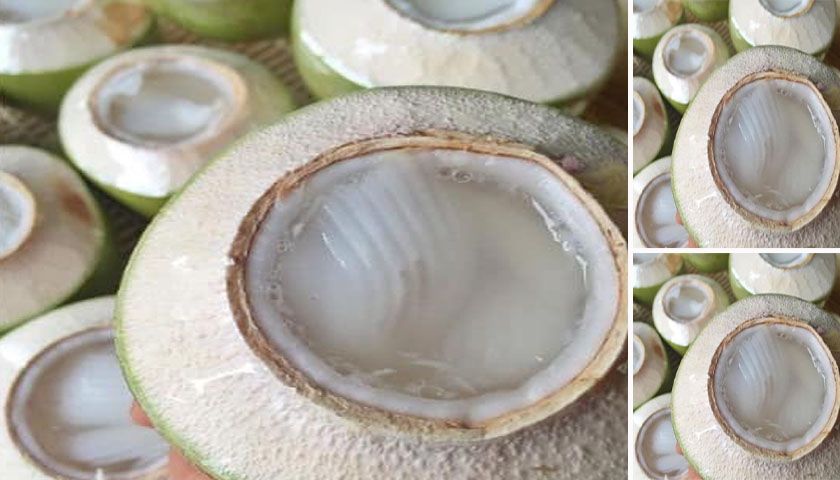 1. เลือกมะพร้าวอ่อนได้ที่ปอกให้สวยงาม แช่น้ำซึ่งผสมน้ำส้มสายชู ทิ้งไว้5-10 นาที เพื่อไม่ให้เปลือกมะพร้าวดำ
