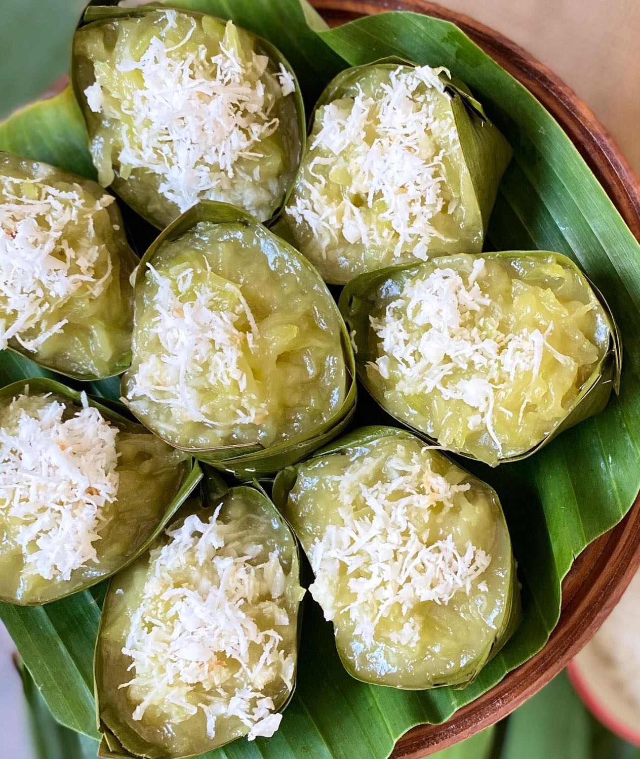 ทำกระทงใบเตย แล้วตักขนมใส่ให้พอดี
