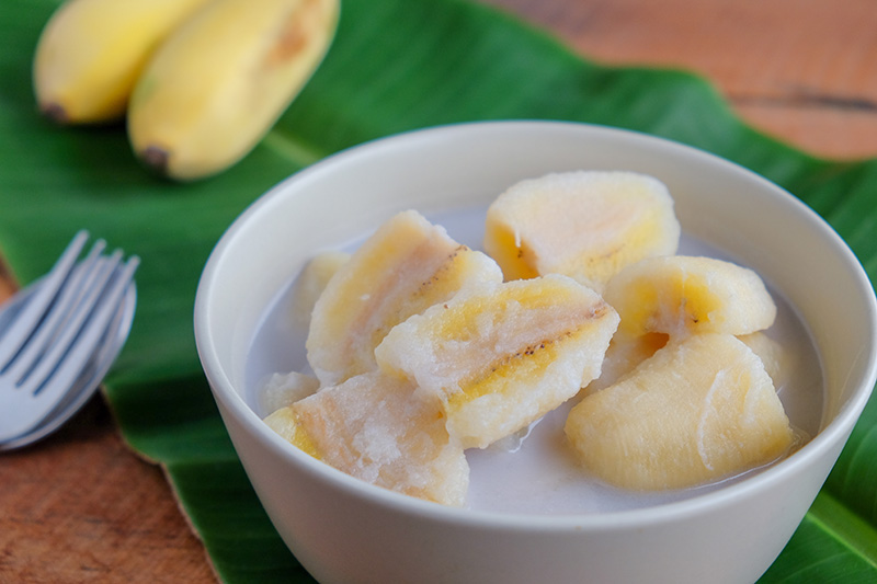 - ตั้งน้ำกะทิใช้ไฟปานกลางค่อนไปอ่อน ใส่น้ำตาลปี๊บ น้ำตาลทราย เกลือ และใบเตย คนให้ทุกอย่างละลาย ใส่กล้วยนึ่งลงไป รอจนเดือด ปิดไฟ