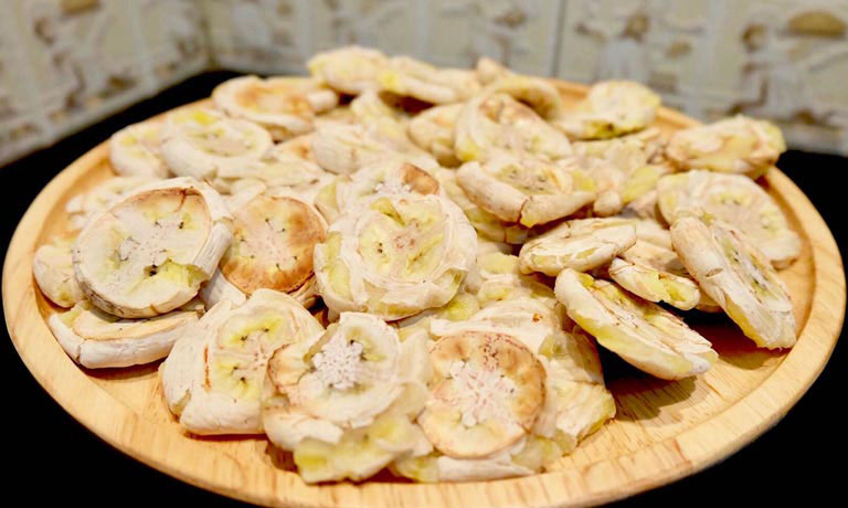 ☆ นำกล้วยน้ำว้าไปอบด้วยหม้ออบลมร้อน ประมาณ 5 นาที ใช้ไฟที่อุณหภูมิ 225 องศาเซลเซียส