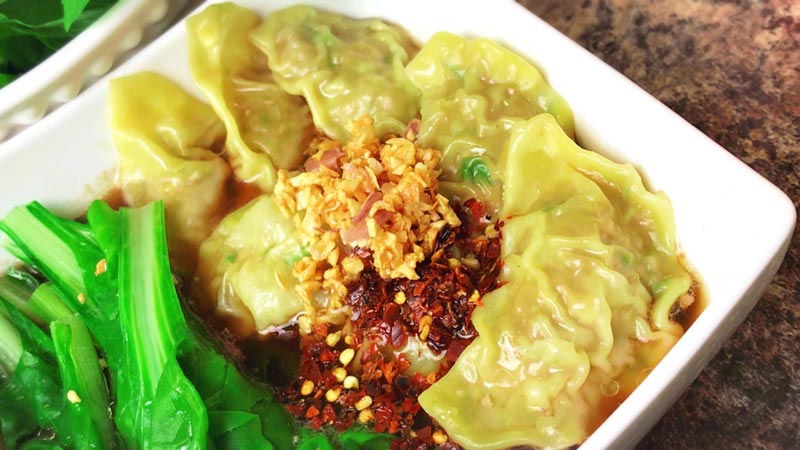 ☆ ใส่เกี๊ยวลงไปต้มในน้ำเดือด ตักขึ้นพักให้สะเด็ดน้ำ และเอาผักไปลวกตามชอบ เสร็จแล้วเอามาราดน้ำเย็นเพื่อให้สีสวย