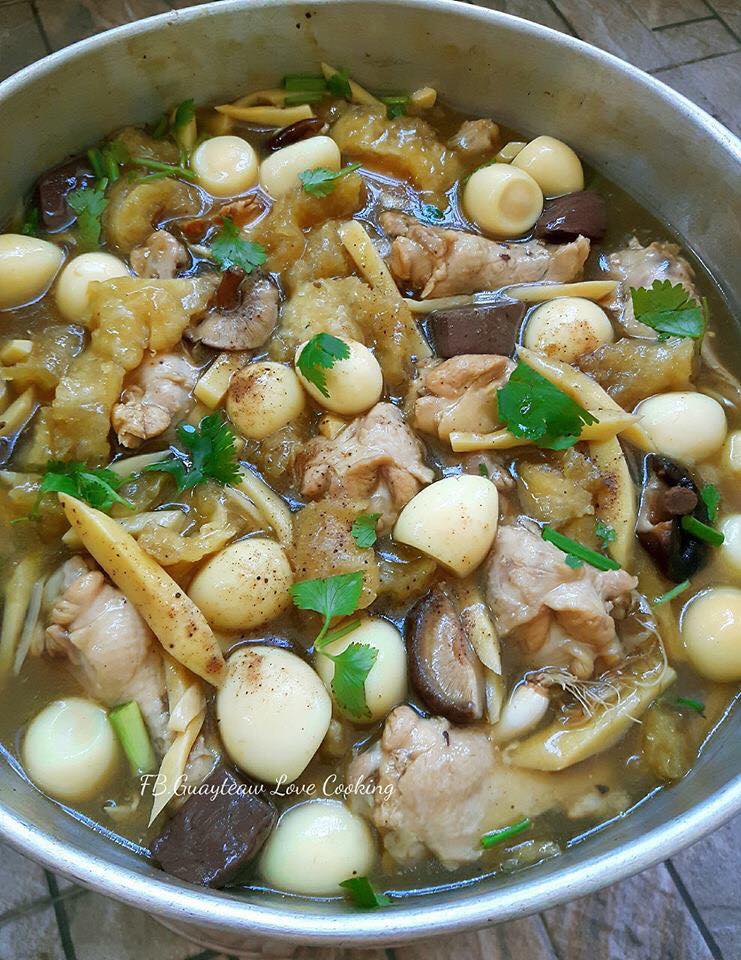 3.จากนั้นตักโครงไก่ออกเหลือน่องไก่ไว้ ตั้งน้ำซุปต่อไป พอน้ำซุปเดือด ใส่หน่อไม้ ,ใส่กะเพาะปลา ,เห็ดหอม , ปรุงรสชาติด้วย ซีอิ๊วขาว , ใส่ซีอิ๊วดำหวานเพิ่มสีสันให้น่ากิน ,ใส่จิ๊กโฉว่ลงไปสักหน่อยเพิ่มความหอม (หากไม่มีก็ไม่ต้องใส่ค่ะ) ใสน้ำตาลลงตาม ชิมดูให้ได้รสชาติที่กลมกล่อม