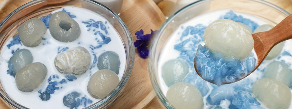 แจกสูตรทำ “ข้าวเหนียวเปียกอัญชันลำไย” ใส่เครื่องเคราแบบจัดเต็ม ราดน้ำกะทิตามชอบ