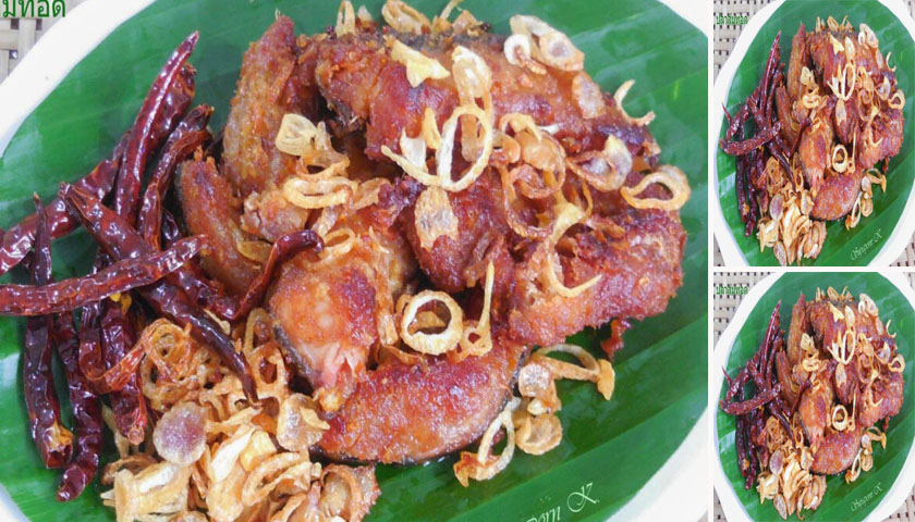 4.ทอดหอม พริก แล้วนำชิ้นปลาส้มลงทอด ใช้ไฟกลางๆ พอสุกจัดใส่จาน ทานกับข้าวเหนียว หรือข้าวสวย