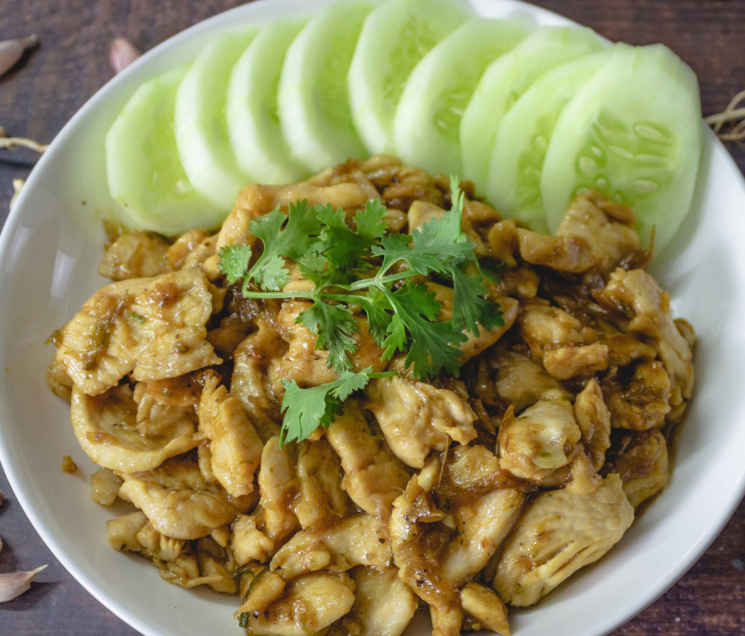 4.เมื่อไก่สุกแล้วปิดแก๊ส ตักไก่กระเทียมใส่จาน อาจจัดแตงกวาวางรอบจานตามชอบ