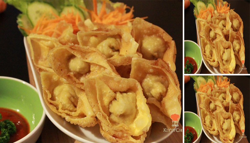 ทอดไฟกลางให้แผ่นเกี๊ยวเหลืองสุกกรอบ