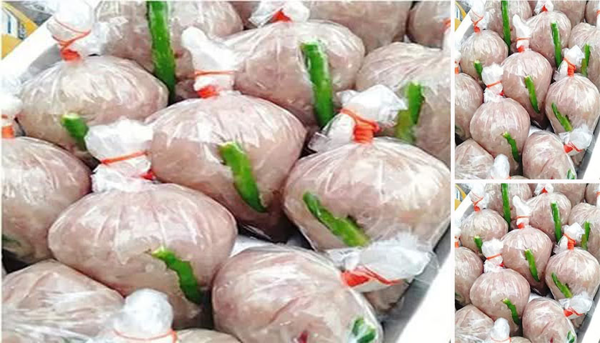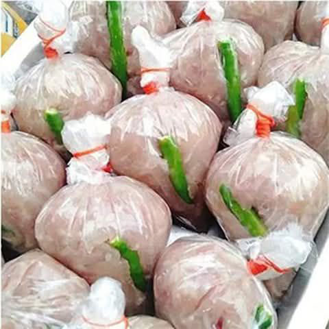 – นำมาผสมกับ หมูบด หนังหมู กระเทียม ปรุงด้วยเกลือและผงชูรส นวดให้เหนียวเข้ากันดีประมาณครึ่งชั่วโมง