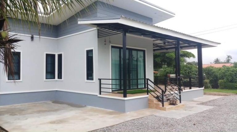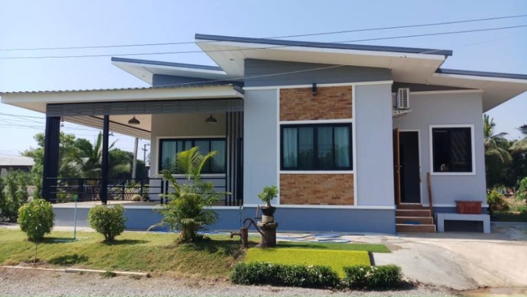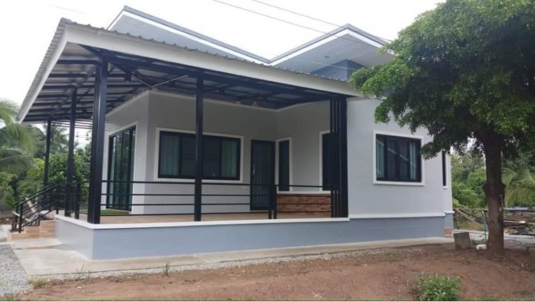 บ้านชั้นเดียวสไตล์โมเดิร์น หลังคาทรงเพิงแหงน มุงเมทัลชีท ต่อเฉลียงหลังคาออกมาทางด้านหน้าและด้านข้างบ้าน