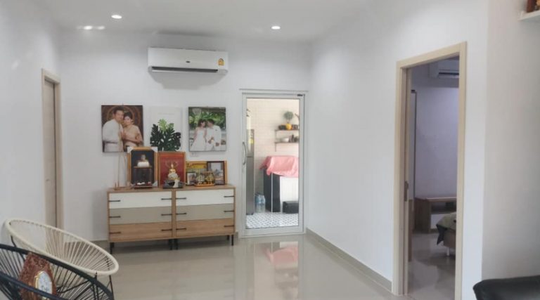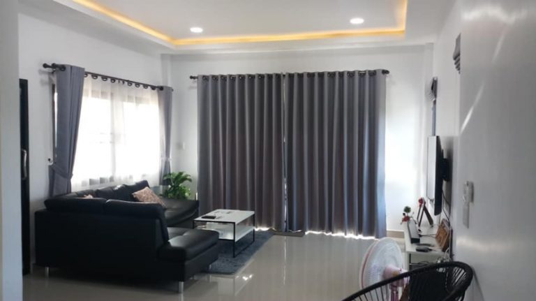 ด้านในบ้านกว้างขวางตกแต่งน่าอยู่ ฝ้าเพดานเป็นฝ้าหลุมซ่อนไฟLED ผ้าม่านสองชั้นโทนสีเทา