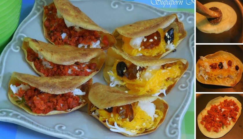 -ไส้หวาน ใส่มะพร้าว ฝอยทอง ลูกพลับ ฟักเชื่อม ลูกเกด โรยงาขาวคั่ว ใช้เกรียงแซะขนมออก พับครึ่ง กดไว้สักพัก แล้วตักขึ้นวางบนตะแกรง