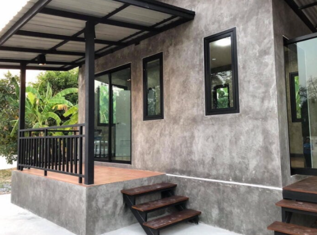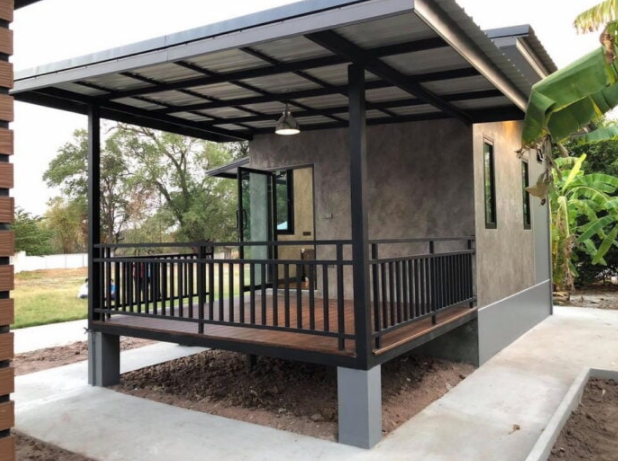 บ้านหลังนี้ขนาดกำลังพอเหมาะ 1 ห้องนอน 1 ห้องน้ำ ใช้งบประมาณ 350,000 บาท มีพื้นที่พักผ่อนที่เป็นระเบียงด้านข้าง