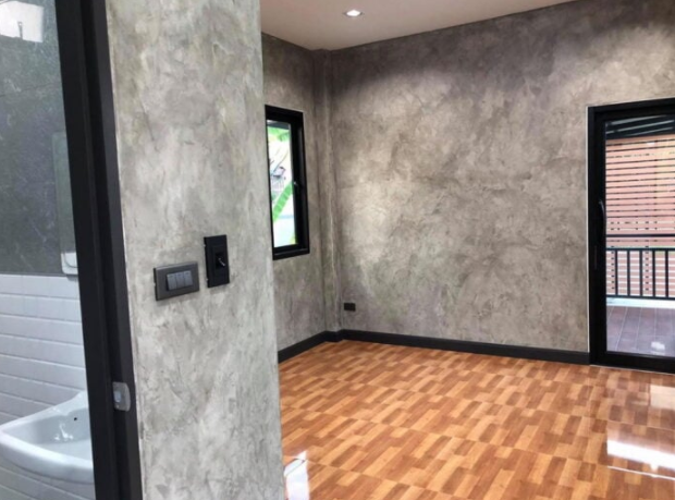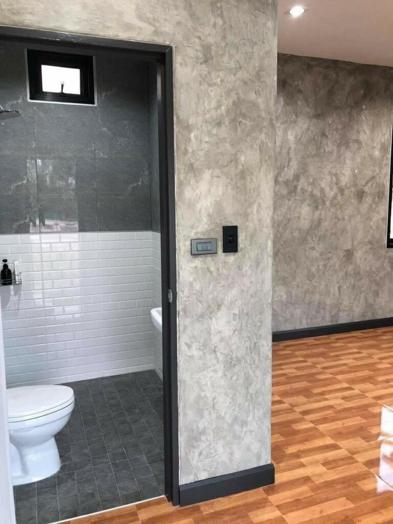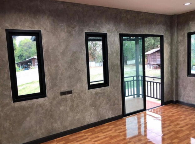 ด้านในบ้านผนังปูนเปลือยขัดมัน พื้นปูด้วยกระเบื้องลายไม้สีน้ำตาล