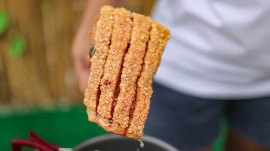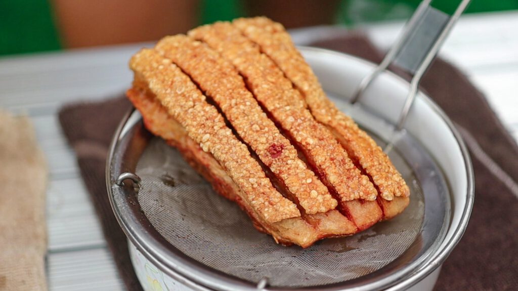 5.ทอดรอบ 2 ตั้งกะทะให้น้ำมันร้อนจัด แล้วนำหมูมาทอดต่อจนหนังหมูพองเหลืองกรอบ