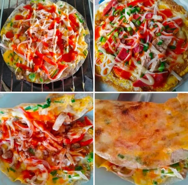 3.เทไข่ลงบนแผ่นแป้งที่ปิ้งอยู่ เกลี่ยไข่ให้ทั่วแผ่นแป้ง