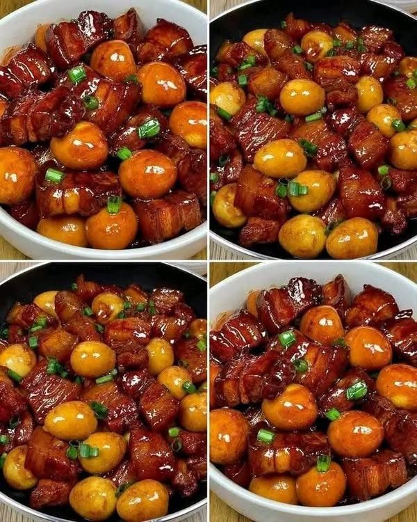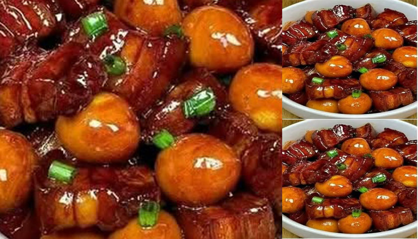 -นำน้ำตาลปี๊บหรือน้ำตาลมะพร้าวใส่ในกะทะ2ช้อนโต๊ะใส่น้ำปลา3ช้อนโต๊ะ คนน้ำตาลปี๊บกับน้ำปลาไปเรื่อยๆจนเริ่มข้นใส่สามเกลอ ลงไปผัดรวมกัน นำหมู3ชั้นและไข่นกกะทาใส่ลงไป คนให้เข้ากัน