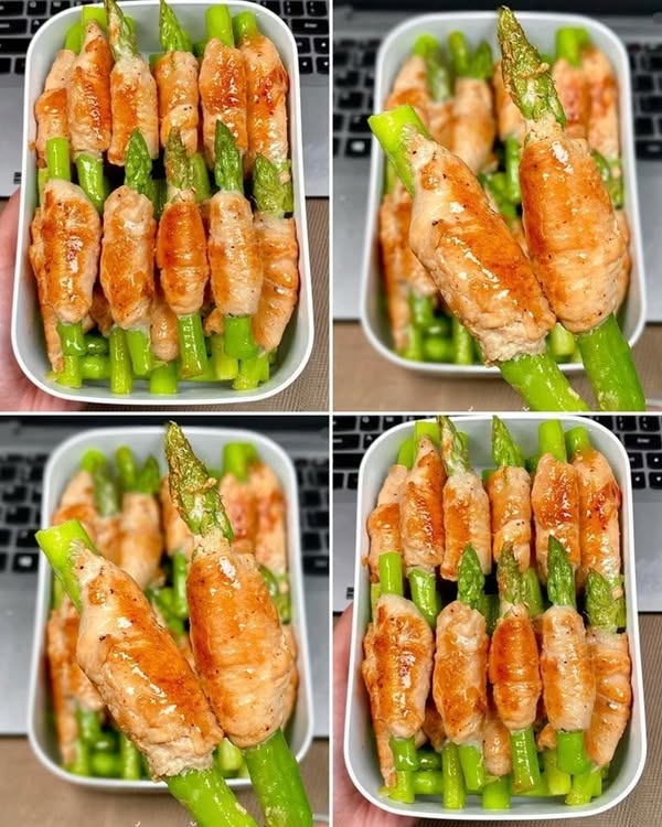 – ม้วนหมูสไลด์รอบหน่อไม้ฝรั่งให้แน่น ทำซ้ำจนหมด