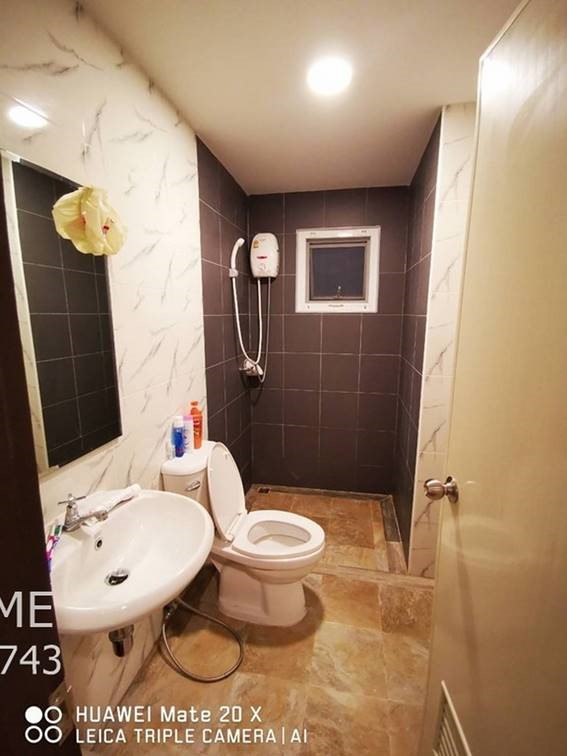 ห้องน้ำออกแบบเรียบง่ายใช้โทนสีอบอุ่นอย่างสีน้ำตาลและสีขาว จัดวางสุขภัณฑ์ครบครันพร้อมใช้งาน
