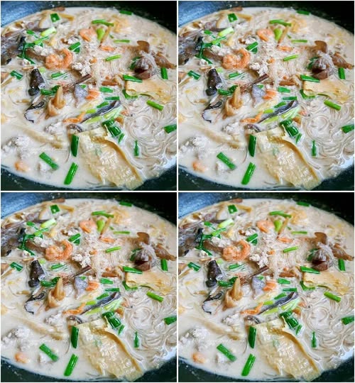 จากนั้นใส่กุ้งแห้ง ดอกไม้จีน ฟองเต้าหู้ เห็ดหูหนู ที่แช่น้ำไว้ลงไปปรุงรสชาติด้วย น้ำปลาเล็กน้อย อย่าใส่เยอะ เพราะในเครื่องแกงร้อนที่โขลกรวมกันไปมีความเค็มจากกะปิอยุ่แล้ว น้ำตาลก็ใส่เพียงเล็กน้อยเพราะกะทิมีความหวานอยุ่แล้ว จากนั้น ใส่วุ้นเส้นลงตาม คนผสมอีกเล็กน้อย จึงปิดไฟ โรยด้วยต้นหอมหั่น ตักใส่ถ้วย ทานได้ค่ะ