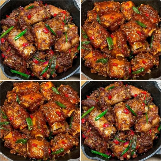 5.ใส่ซี่โครงหมูที่ทอดไว้ลงไปในกระทะ ปรุงรสด้วยน้ำปลา ซอสหอยนางรม และน้ำตาลทราย
