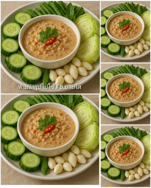 ตักใส่ถ้วย เสิร์ฟคู่กับผักสด เช่น แตงกวา ถั่วฝักยาว กะหล่ำปลีลวก หรือผักต้มอื่น ๆ