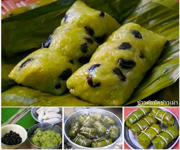 – ใส่ถั่วและข้าวเม่าที่ผัดลงบนใบตอง ใส่กล้วยแล้วห่อ มัดด้วยตอก นำไปนึ่งบนน้ำเดือด 20-25 นาที