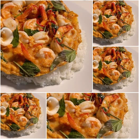 ใส่กุ้ง ปลาหมึก หอย ลงไปคลุกกับน้ำแกง