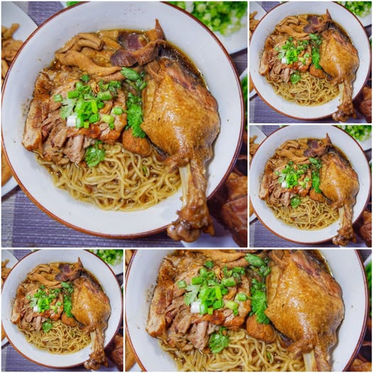 6. จัดเสิร์ฟ → ใส่เส้นบะหมี่ในชาม วางเป็ดพะโล้หั่นชิ้น ราดน้ำพะโล้เล็กน้อย โรยกระเทียมเจียว และผักลวก เสิร์ฟพร้อมน้ำซุปพะโล้ร้อน ๆ