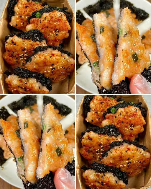 – จากนั้นทาส่วนผสมลงบนสาหร่ายแต่ละชิ้น โรยงาไว้ด้านบน