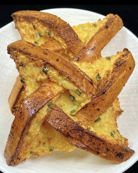 – วางขนมปังลงใน หม้อทอดไร้น้ำมัน (Air Fryer) ตั้งอุณหภูมิ 180 องศาเซลเซียส อบประมาณ 6 นาที จากนั้นพลิกกลับด้าน แล้วอบต่ออีก 3 นาที จนกรอบและหอม