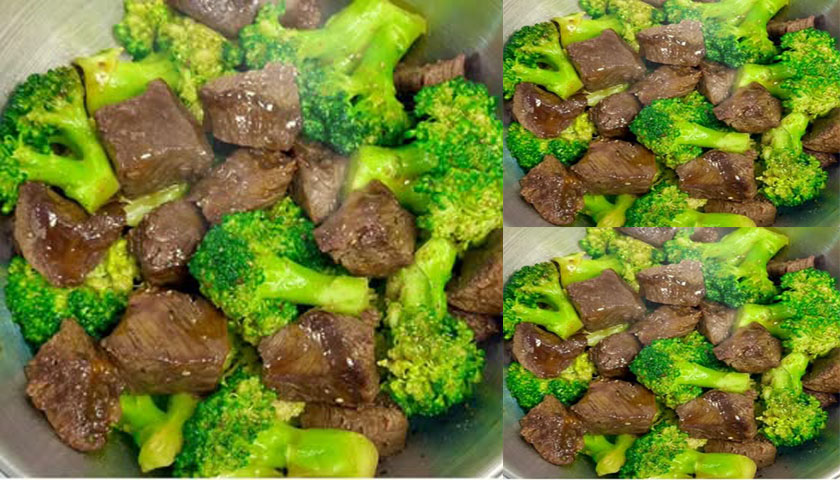 – ใส่เนื้อวัวหั่นเต๋าในชาม เติมซีอิ๊วขาว 1 ช้อนชา + แป้งข้าวโพด 1 ช้อนชา + น้ำมันพืช ½ ช้อนชา คลุกเคล้าให้เข้ากัน พักไว้ 10 นาที