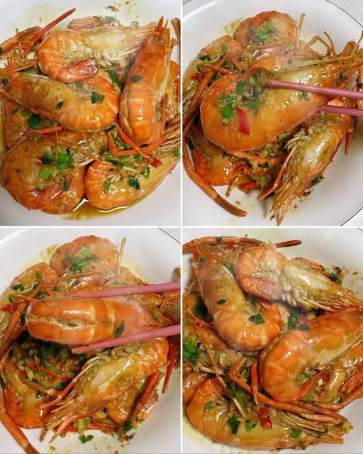 – ตักน้ำมันที่ทอดกุ้งให้เหลือ ๑ ทัพพี ตั้งไฟกลาง นำกระเทียมโขลก รากผักชีโขลก พริกไทยขาวโขลก ผัดให้หอม