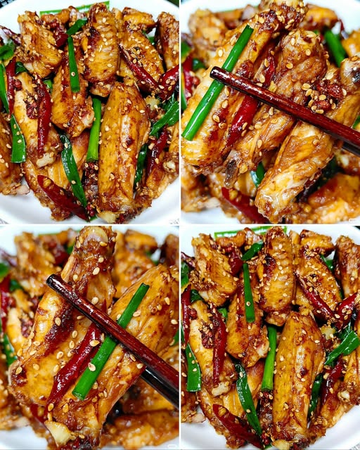 แล้วปีกไก่ทอดลงไป คลุกเคล้าคั่ว ๆ ให้เข้ากันดี โรยต้นหอมซอยปิดท้าย