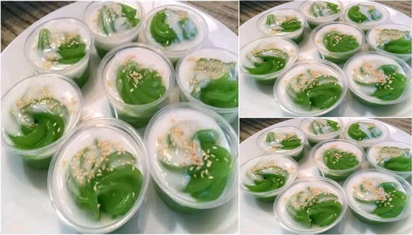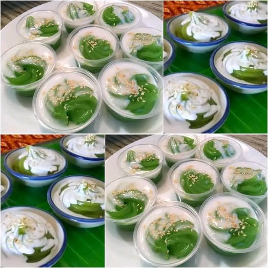 4.ใส่ขนมเปียกปูนแล้ว ก็ราดหน้าด้วยกะทิเลยคะ อย่าลืมโรยงาขาวคั่วหอมๆ พร้อมเสิร์ฟความอร่อย