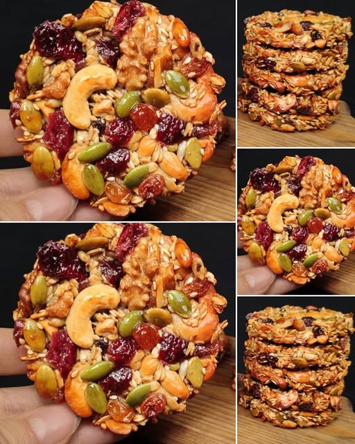 -เติมข้าวโอ๊ต อัลมอนด์ เมล็ดฟักทอง เมล็ดทานตะวัน งา ลูกเกด อบเชย เเละเกลือ คนให้เข้ากันจนเป็นเนื้อเดียว