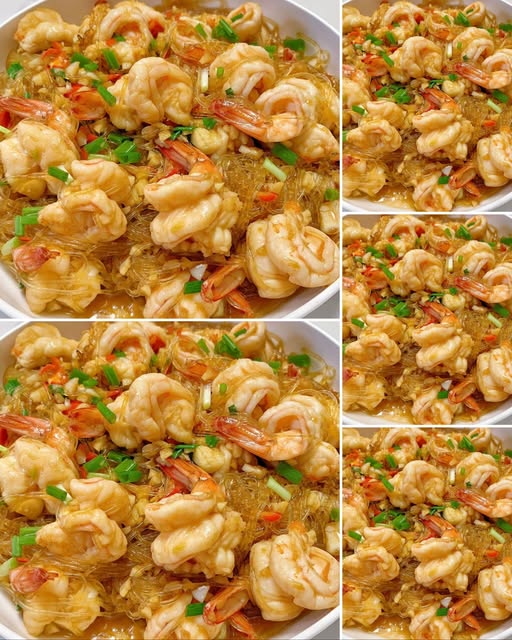 6.ลดไฟ ใส่กุ้งลงให้สวยงาม ใส่วุ้นเส้นที่คลุกเรียบร้อย ปิดฝา อบ 10 นาที ใส่ขึ้นฉ่าย