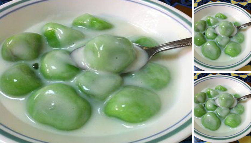 น้ำกะทิราด ใส่น้ำเปล่าตั้งไฟ ใส่น้ำตาล ใบเตยผูกข้อ พอน้ำตาลละลาย น้ำใบเตยออก ใส่กะทิ และเกลือ พักไว้จนเย็น