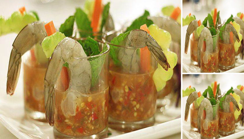 จ้ดจานด้วยเครื่องรอไว้ เมื่อครบเวลาแล้ว น้ำกุ้งวางใส่จาน ราดน้ำจิ้ม โรยหน้าด้วย กระเทียมฝานและใบสะระแหน่6. จัดใส่แก้วช็อตก็น่ารักน่ากินไปอีกแบบจ้า