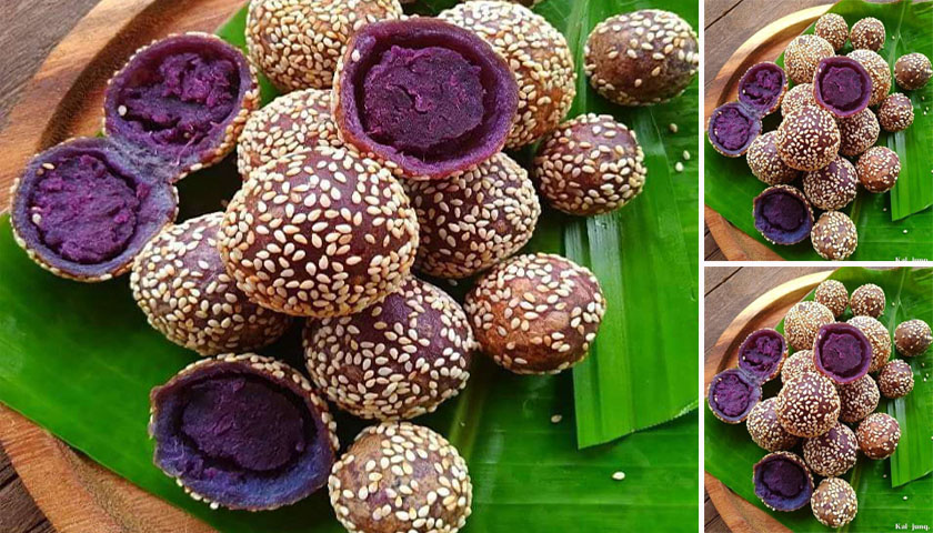 แจกสูตรทำ “ขนมงาทอดมันม่วง” ขนมก้อนกลมๆสีม่วง ไส้ถั่วเหลือง กรอบนอกนุ่มใน หอมงาขาว