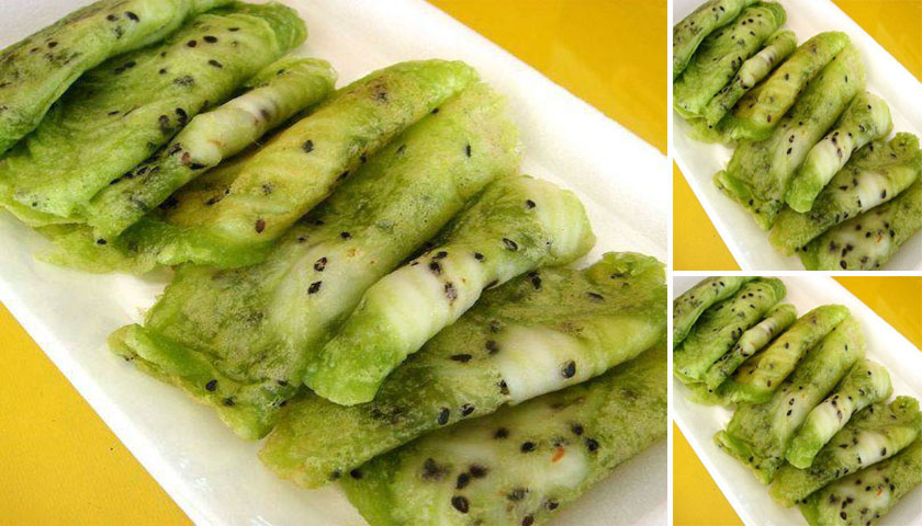 เมื่อแป้งสุกจะพองตัวขึ้น ให้พลิกกลับด้าน เมื่อแป้งสุกทั้องสองด้านให้ม้วนแล้วตักขึ้น -