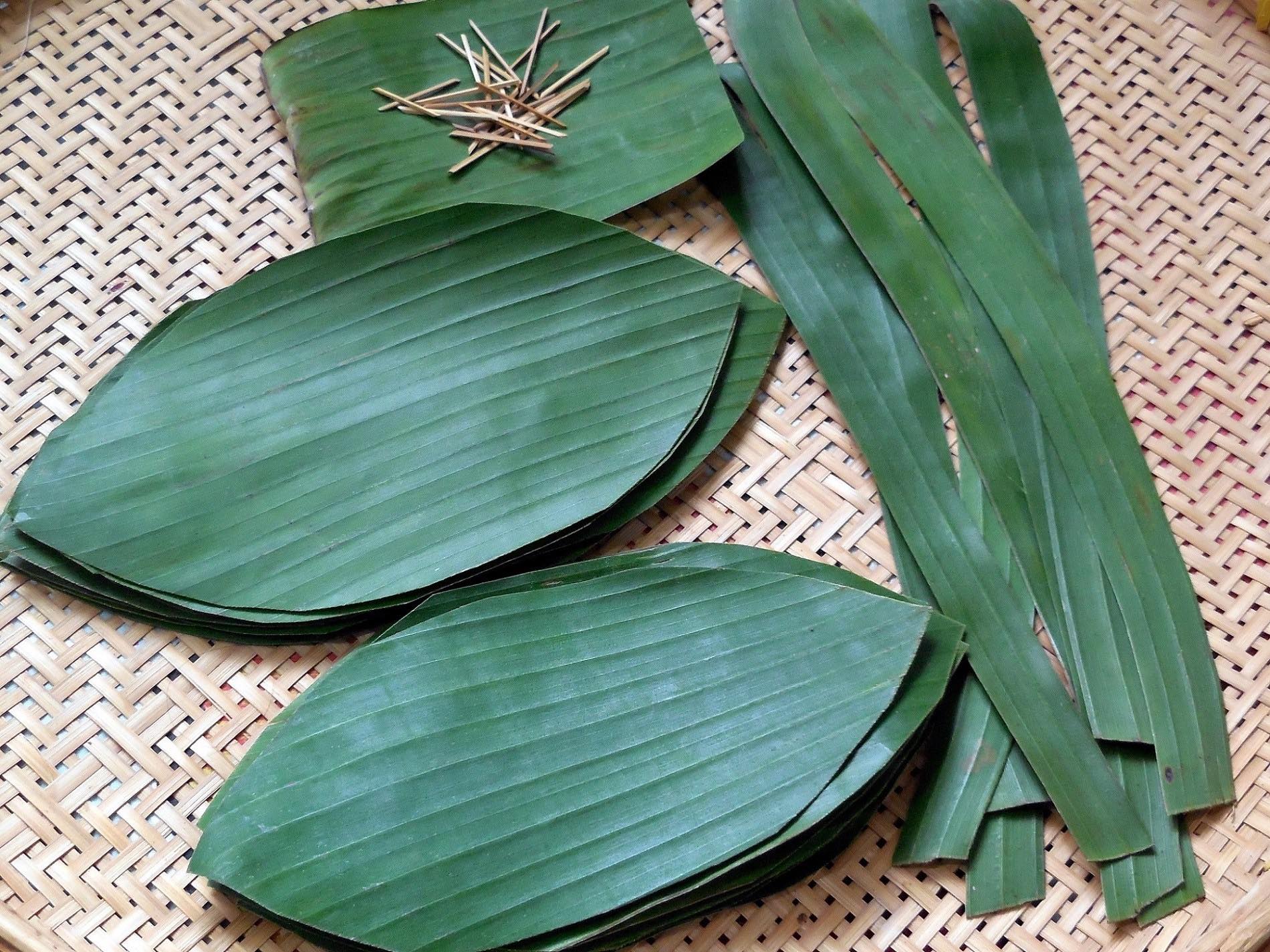 1.เตรียมใบตอง โดยเจี ย นใบตoง เป็นสองขนาด และฉี กเป็นเ ส้ นย าว เพื่อทำส ายค าด (เตี่ ย ว) ปกติจะใช้ใบมะพร้ าวค าดค่ะ