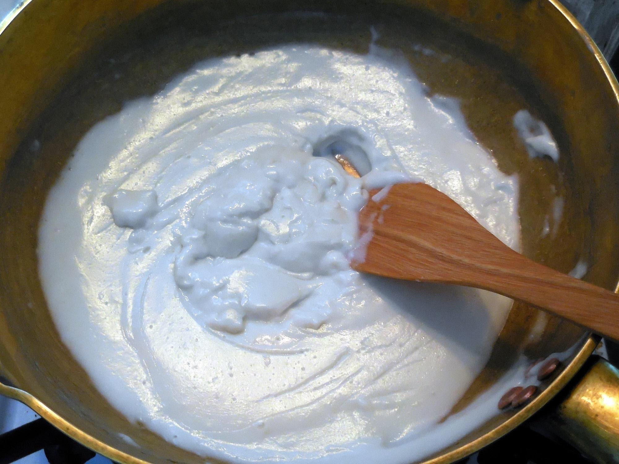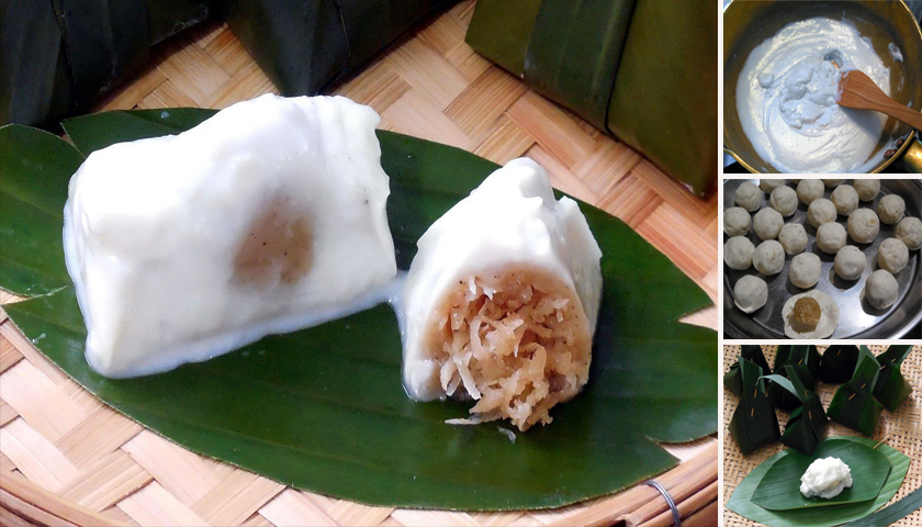 ล ดไ ฟกลางๆค่อนข้างอ่อน กว นจนมะพร้ าวมีลักษณะเส้นใส และเหนียวขึ้น ห ยิ ยมาปั้ นไ ส้ได้ พั กให้เย็น แล้วปั้ นเป็นก้oนกลมๆ ต้องปั้ นไ ส้ให้แ น่ นด้วยค่ะ