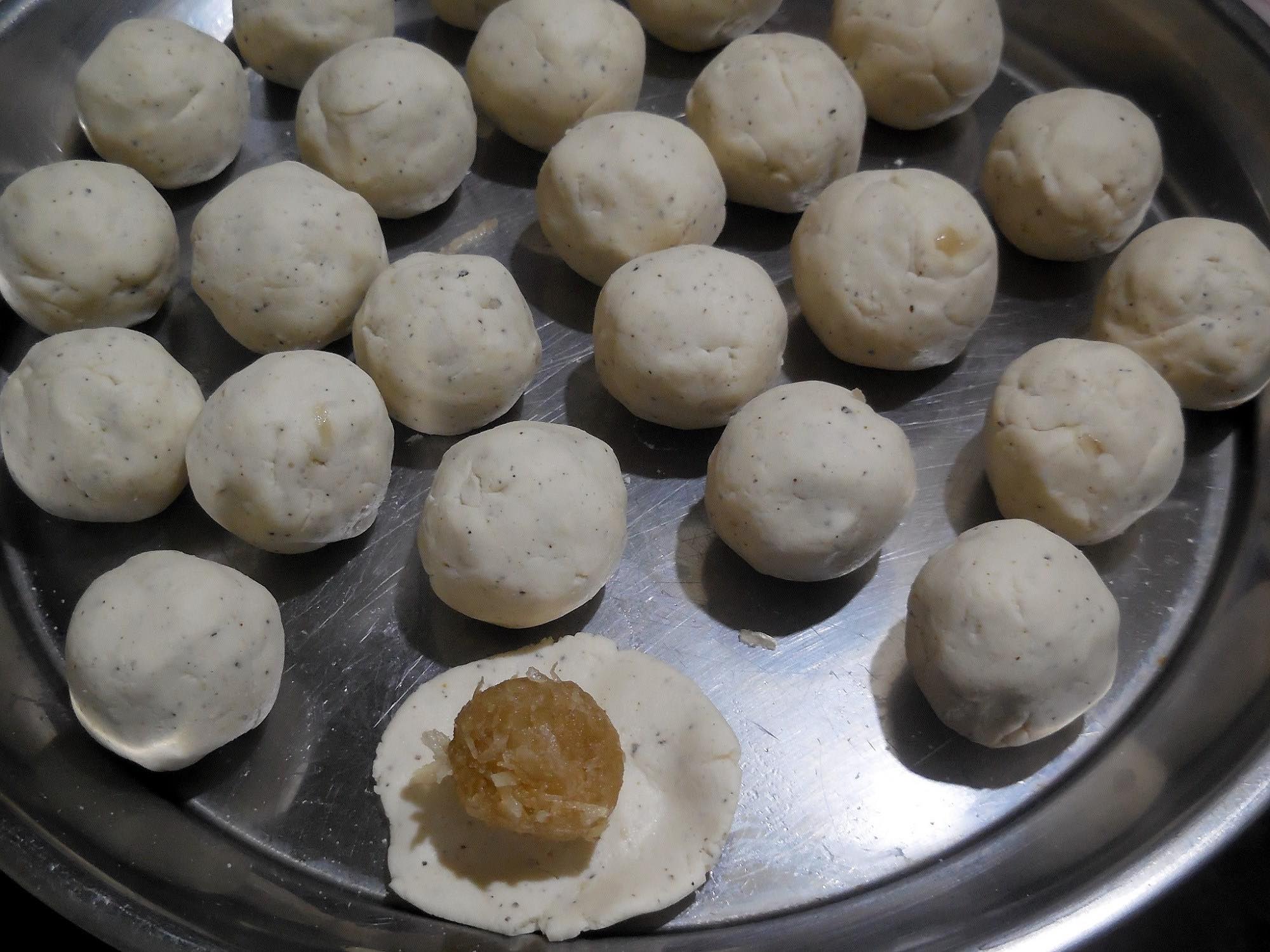 มีลักษณะ ไม่ติ ดภาชนะ พั กไว้ 20 นาที นำมาปั้ นเป็นก้oนกลม แล้วก ดให้แ บ น ใ ส่ไ ส้ที่ปั้ นไว้ลงไป