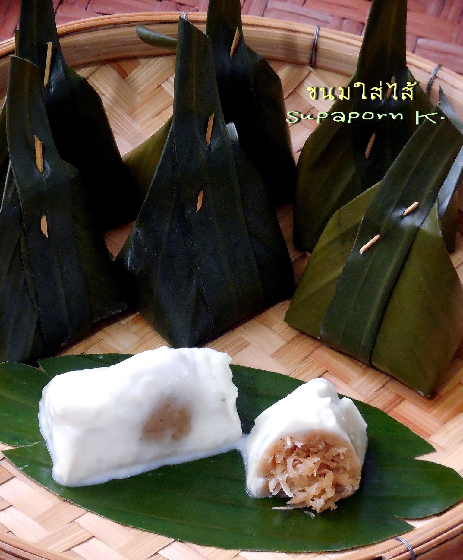 แล้วจึงใ ส่ไ ส้ที่หุ้ มแป้งแล้วลงไป ตั กห น้ ากะทิใส่ด้ านบน 1 ช.ต. ห่oใบตองด้านพั บเข้ามา