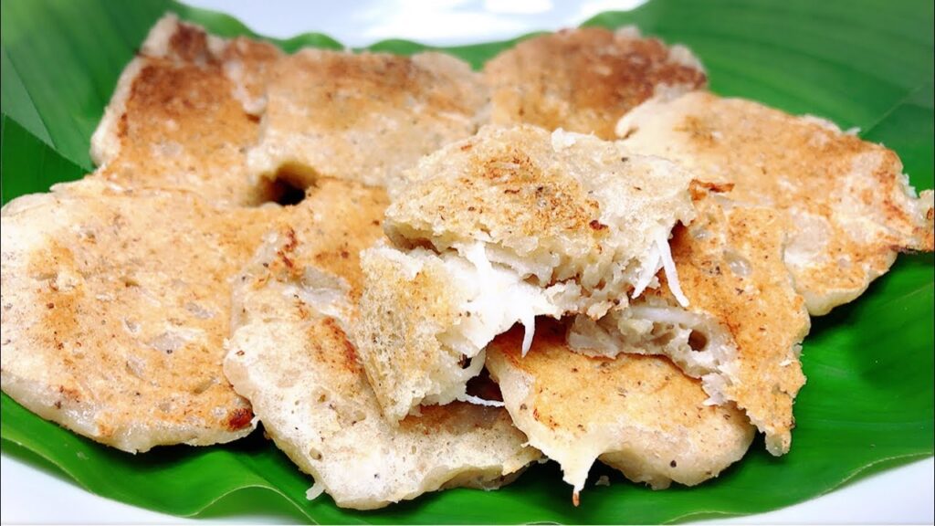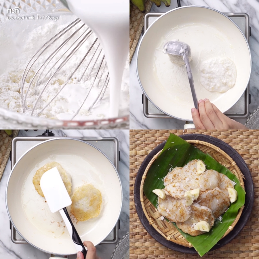3. ตั้งกระทะ ทาน้ำมันบางๆ กันขนม ติดกระทะ ตั กส่วนผสมลงบนกระทะ เกลี่ยให้เป็นวงกลมและเป็นแผนบางๆ