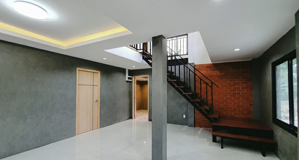 ด้านล่างเป็นห้องโถงผนังปูนเปลือยพื้นกระเบื้องสีขาวตกแต่งฝ้าสีขาว