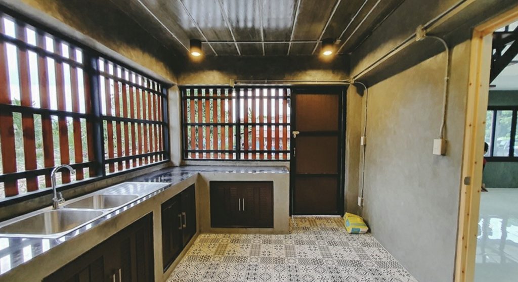 ห้องครัวออกแบบเป็นครัวไทยที่มีผนังด้านหนึ่งที่ใช้ไม้ระแนงตีเว้นร่องเพื่อให้อากาศถ่ายเทได้สะดวก เคาน์เตอร์ตัวแอลขนาดใหญ่ พื้นกระเบื้องลายวินเทจ